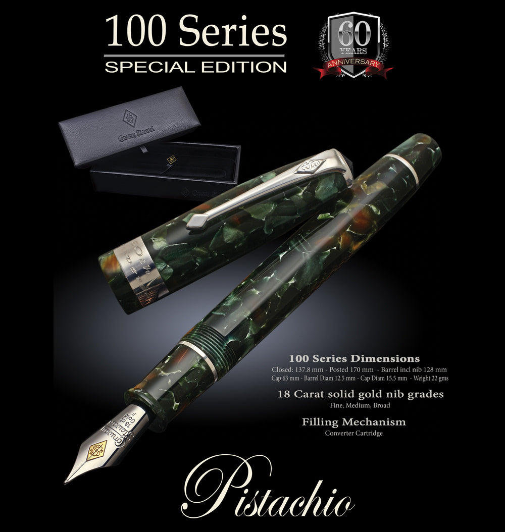 Die 100er-Serie wurde erstmals 1954 auf den Markt gebracht und entwickelte sich schnell zu einem der beliebtesten Oversize-Stifte, die Conway Stewart jemals hergestellt hat. Zur Feier dieses beliebten und ikonischen Modells, das vor 60 Jahren geschaffen wurde, freut sich Conway Stewart, eine Sonderedition der 100er-Serie aus handgefertigtem Pistazienharz herauszubringen – die 60th Anniversary 100 Special Edition. Dies ist der erste Stift der NEUEN 100er-Serie. Wir werden in Kürze eine Kernfarbpalette der 100er-Serie auf den Markt bringen, von dieser Sonderedition gibt es jedoch nur 60 Exemplare. Alle 60 Exemplare sind hergestellt und warten daher in unserer Fabrik auf den Versand. Wir gehen davon aus, dass sie innerhalb weniger Tage vergriffen sein werden! Beeilen Sie sich also und bestellen Sie jetzt, um diese Gelegenheit nicht zu verpassen, Teil der Geschichte zu sein.