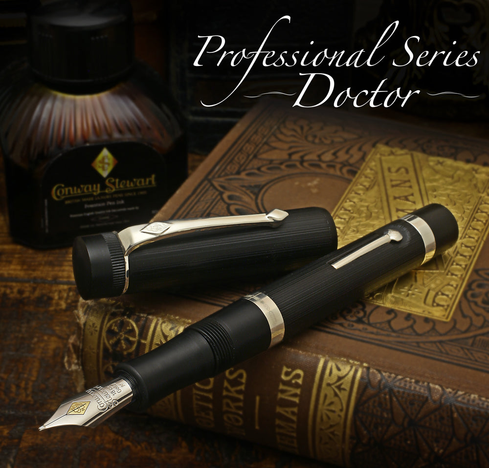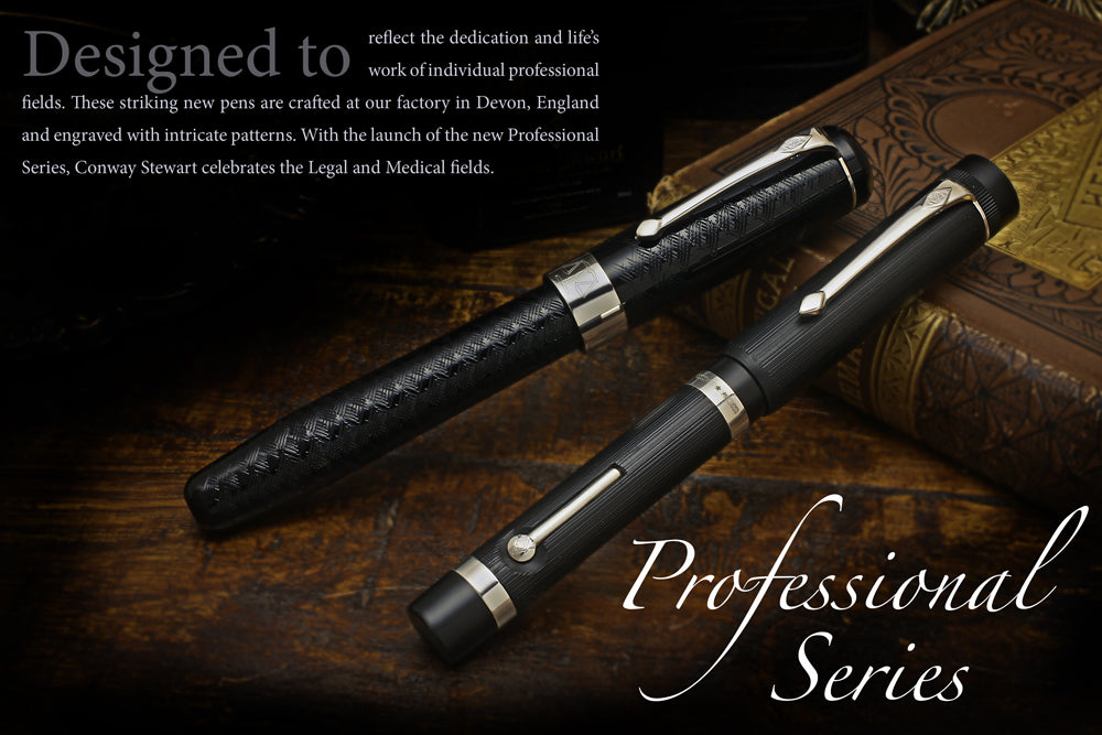 Die neue Conway Stewart Professional Series soll das Engagement und die Lebensleistung einzelner Berufsfelder widerspiegeln. Diese auffälligen neuen Designs sind aus glänzend schwarzem Harz und mattem Ebonit gefertigt und mit komplizierten Mustern graviert. Die Professional-Serie liegt perfekt ausbalanciert in der Hand und verfügt über massive 18-Karat-Goldfedern mit Rhodiumbeschichtung, die zu den punzierten Verzierungen aus Sterlingsilber passen.