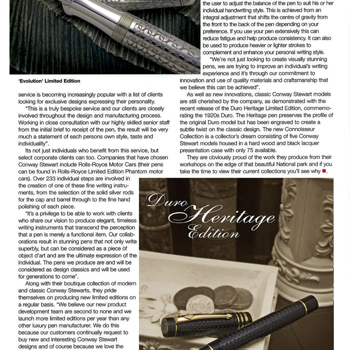 As well as new innovations, classic Conway Stewart models are still cherished by the company, as demonstrated with the recent release of the Duro Heritage Limited Edition, commemorating the 1920s Duro. The Heritage pen preserves the profile of the original Duro model but has been engraved to create a subtle twist on the classic design. The new Connoisseur Collection is a collector's dream consisting of five Conway Stewart models housed in a hard wood and black lacquer presentation case with only 75 available.
