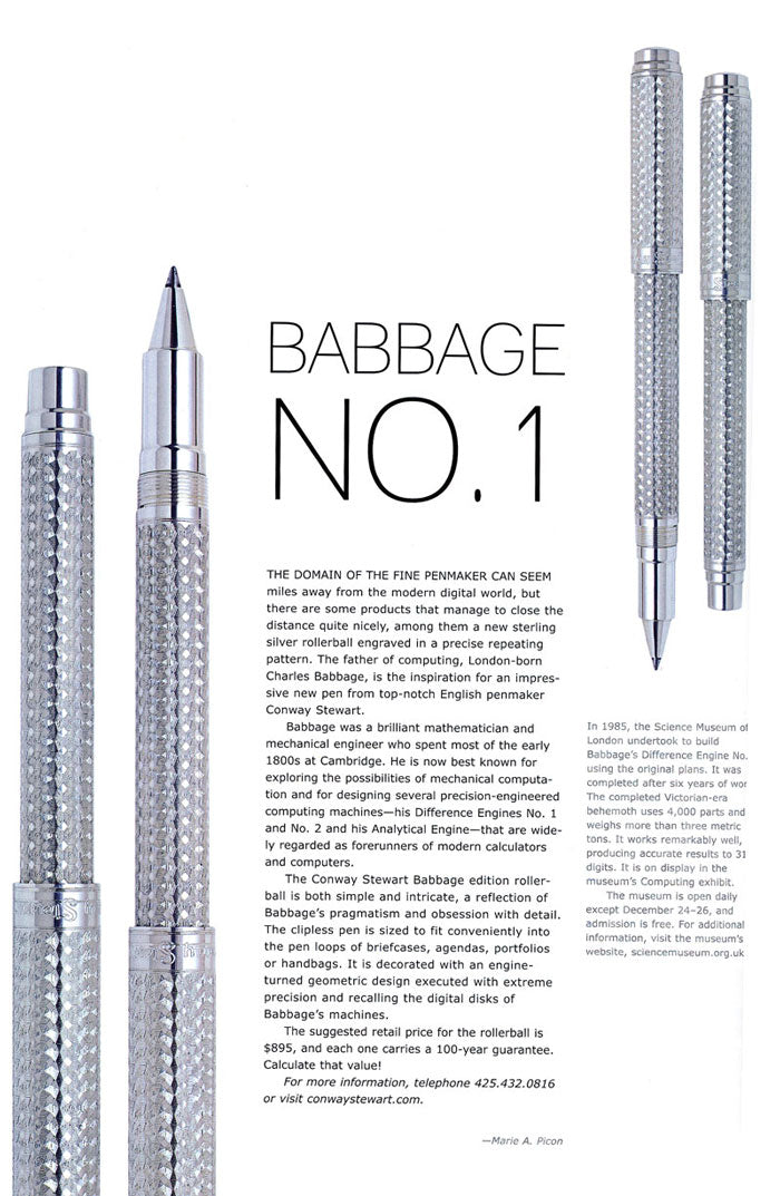 The Conway Stewart Babbage edition roller-ball is both simple and intricate, a reflection of Babbage's pragmatism and obsession with detail. The clipless pen is sized to fit conveniently into the pen loops of briefcases, agendas, portfolios, or handbags. It is decorated with an engine-turned geometric design executed with extreme precision and recalling the digital disks of Babbage's machines.