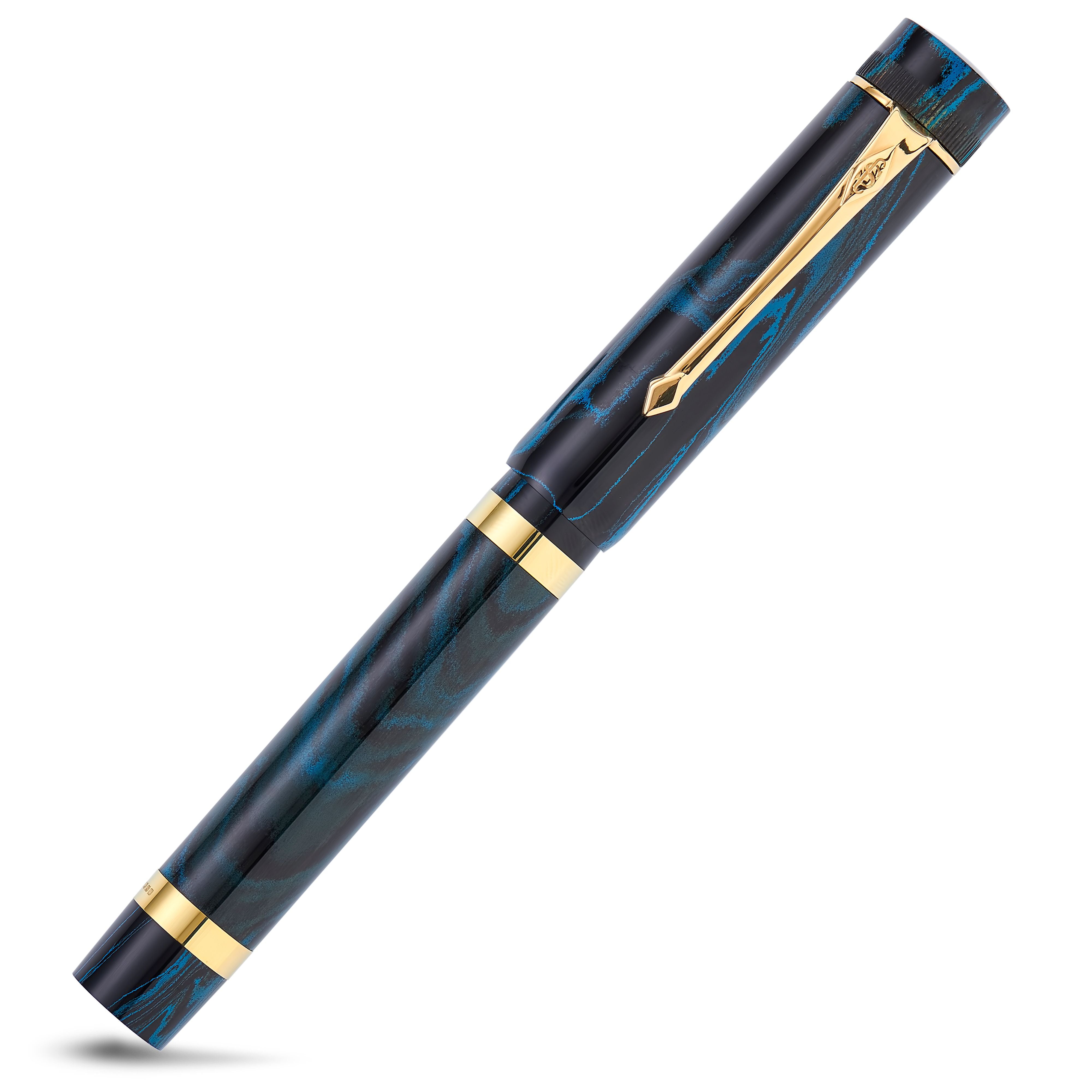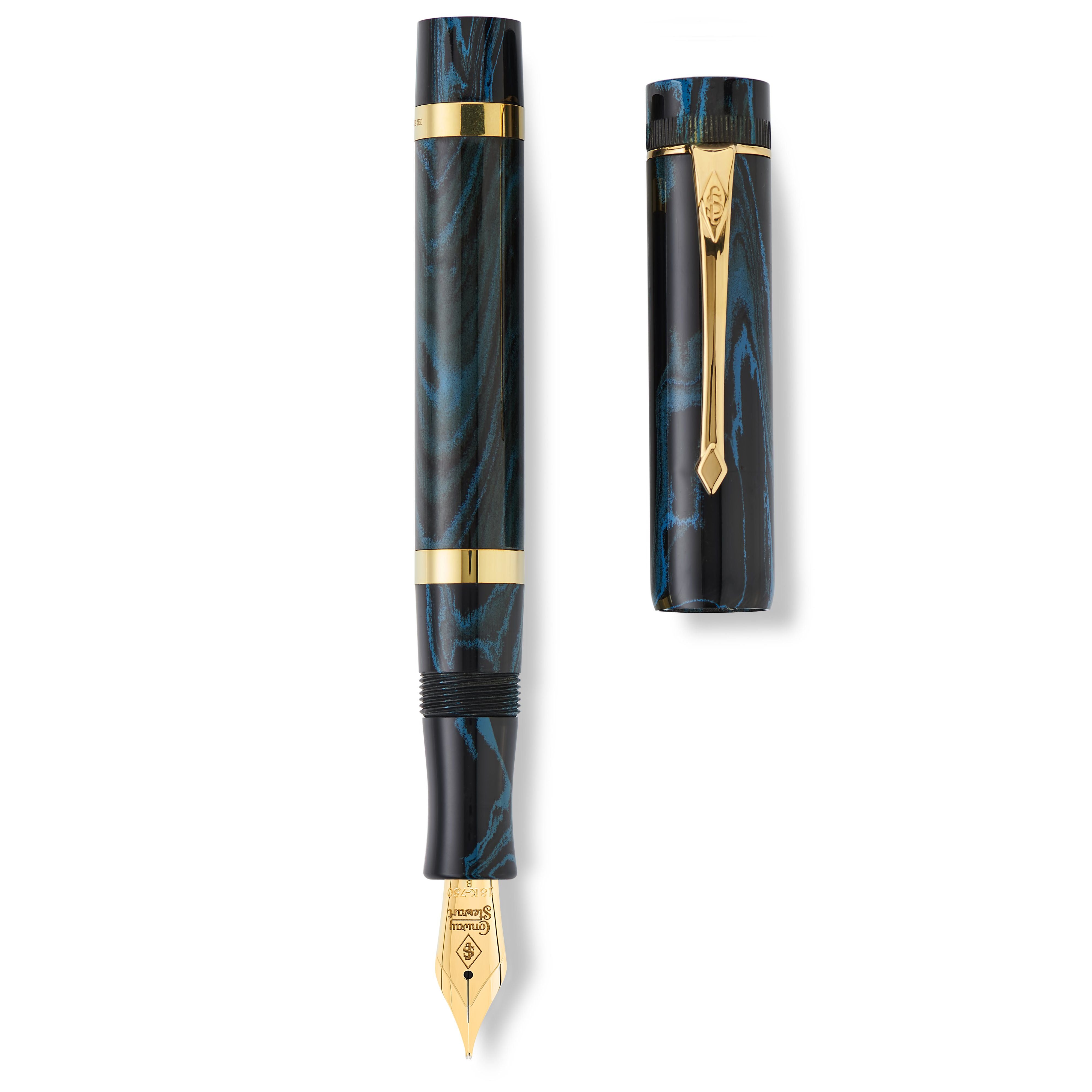 La Conway Stewart Marlborough Vintage Blue Ripple es una impresionante pluma estilográfica que encarna el estilo clásico de los modelos antiguos de Conway Stewart de la década de 1920. Hecho de ebonita de alta calidad, este bolígrafo es uno de los pocos bolígrafos de ebonita que quedan disponibles. El diseño recto del capuchón y el depósito y el clip de arandela de estilo vintage le dan un aspecto atemporal. La pluma presenta un patrón dentado alrededor de la parte superior del capuchón y dos bandas anchas de oro macizo de 9 quilates alrededor del cuerpo, que recuerdan la era Art Deco. El Marlborough Vintage Blue Ripple está cuidadosamente ensamblado, pulido y ajustado por expertos para garantizar su alta calidad.